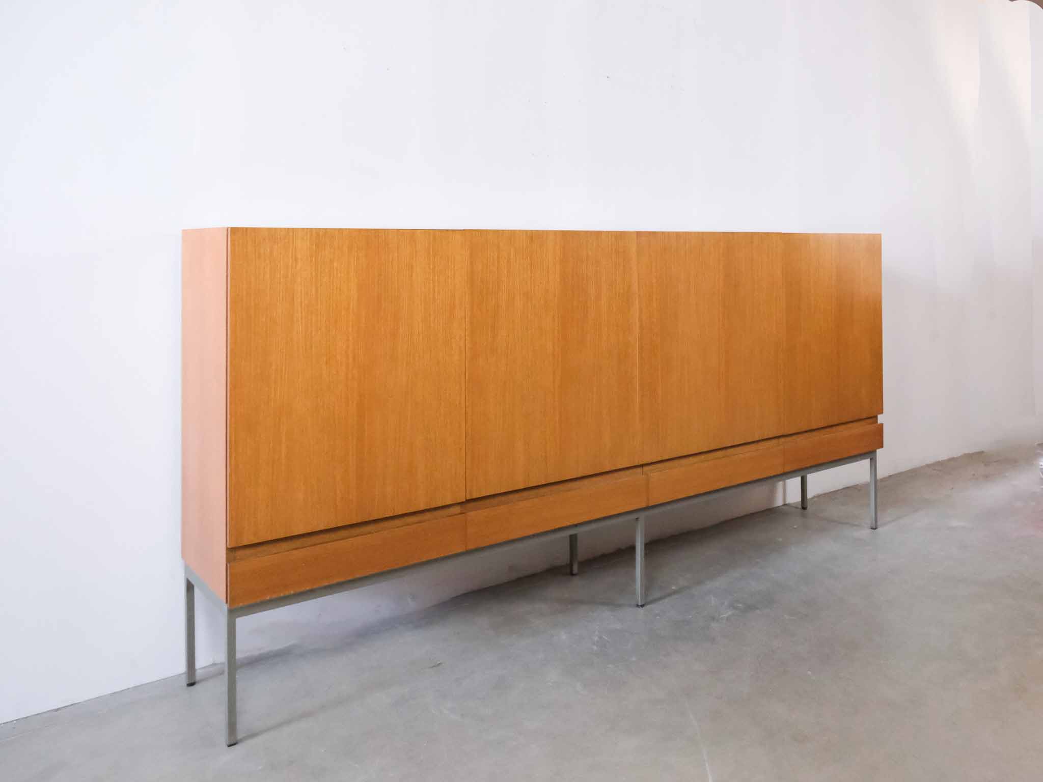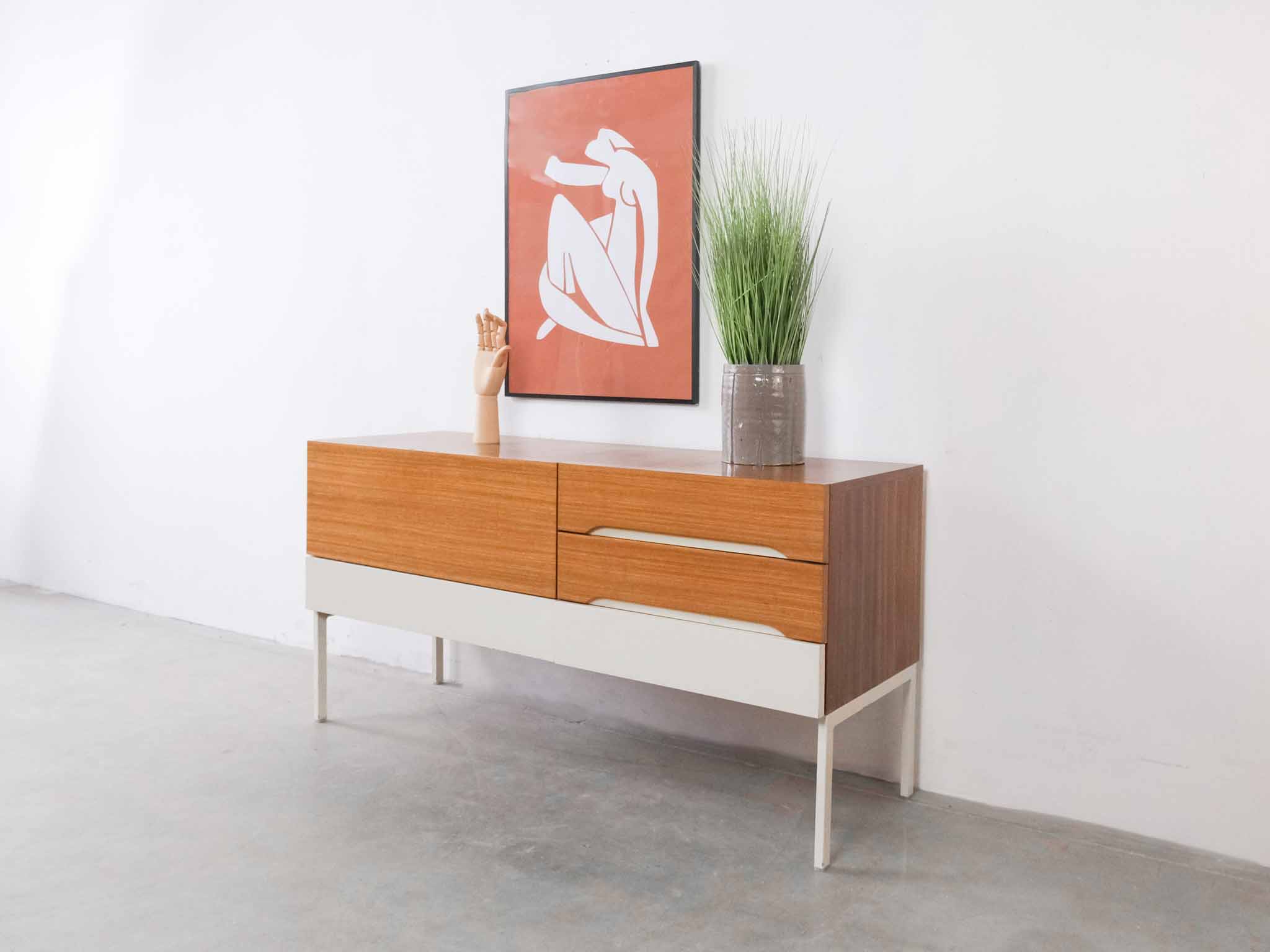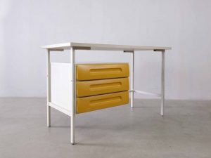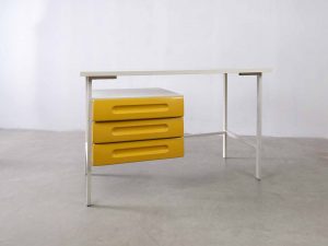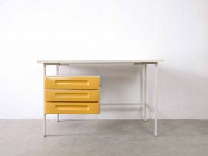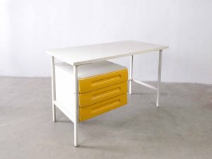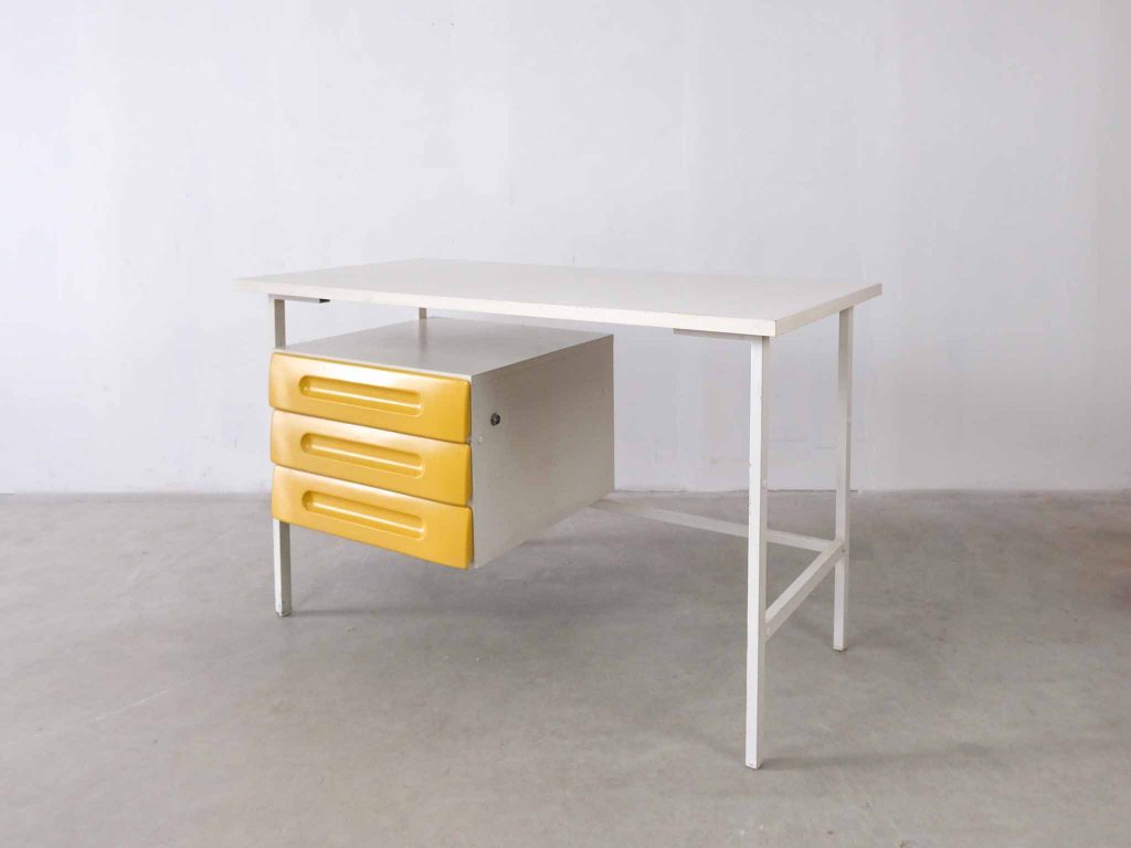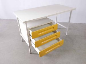 Dieser seltene vintage Schreibtisch von Gwinner stammt aus der Space Age Ära der 1970er Jahre und verkörpert den futuristischen Designgeist dieser Zeit. Klare Linien, ein minimalistisches weiß lackiertes Metallgestell und die markanten gelben Kunststoffschubladen verleihen dem Möbelstück einen unverwechselbaren Charakter. Die drei großzügigen Schubladen bieten praktischen Stauraum und unterstreichen zugleich den funktionalen Anspruch des Designs. Mit seiner Kombination aus kühlem Metall und farblich akzentuierten Kunststoffelementen ist der Schreibtisch ein eindrucksvolles Beispiel für das progressive Möbeldesign der 70er. Ein authentisches Space Age Vintage Stück, das Sammler und Designliebhaber gleichermaßen begeistert.