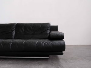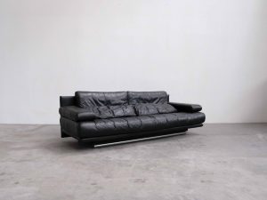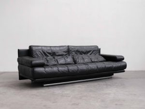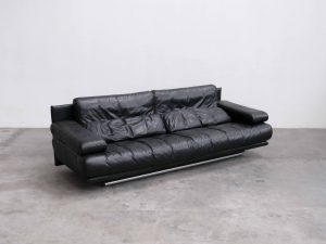 Das schwarze Leder verleiht dem Möbel eine starke, elegante Präsenz, während die großzügige Polsterung für eine lässige, komfortable Sitzfläche sorgt. Dezente Chromdetails unterstreichen den modernen Charakter und geben dem Sofa eine klare, architektonische Linie.