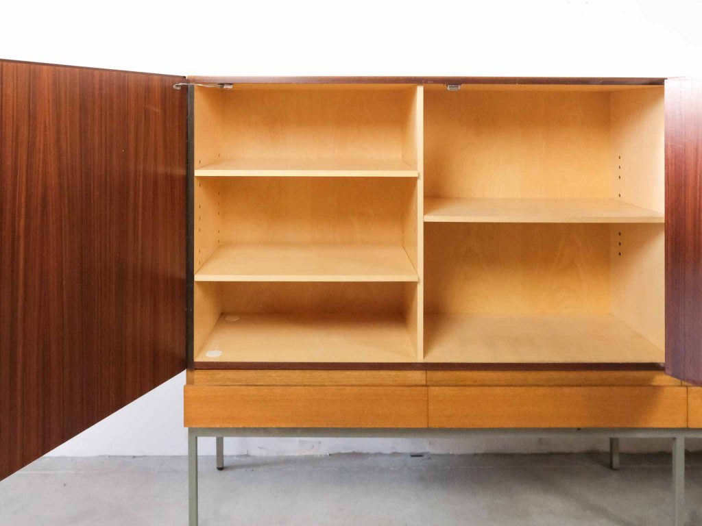 Dieses Highboard ist ein Original B60, entworfen von Dieter Wäckerlin für Behr Möbel Ende der 1950er Jahre. Das minimalistische Design steht exemplarisch für die Mid Century Modern Ästhetik: eine klare, grifflose Front in edlem Holzfurnier, getragen von einem schlanken Metallgestell. Hinter den vier Türen verbirgt sich großzügiger Stauraum mit variablen Einlegeböden, ideal für Geschirr, Bücher oder Sammlerstücke. Die Kombination aus warmer Holzoberfläche und kühlem Metall verleiht dem Highboard zeitlose Eleganz und Leichtigkeit. Als seltenes Sammlerstück verbindet es höchste Funktionalität mit puristischem Design und ist ein Highlight für Liebhaber hochwertiger Vintage-Möbel und Space Age Minimalismus.