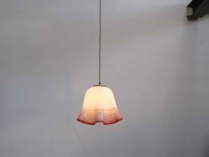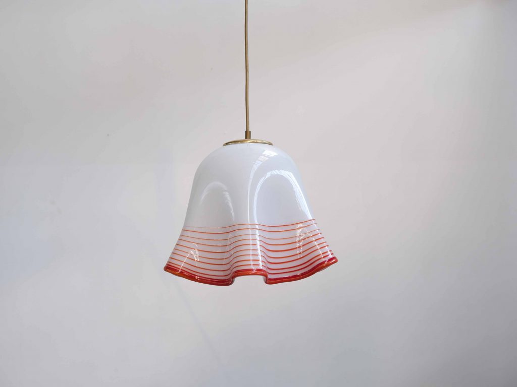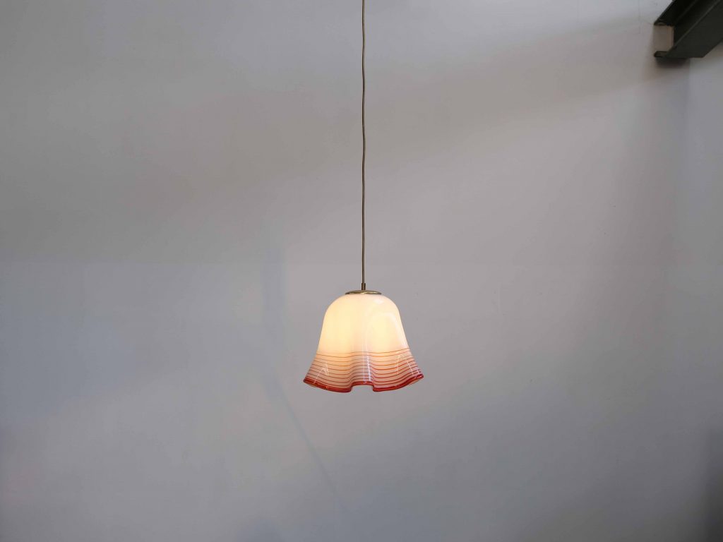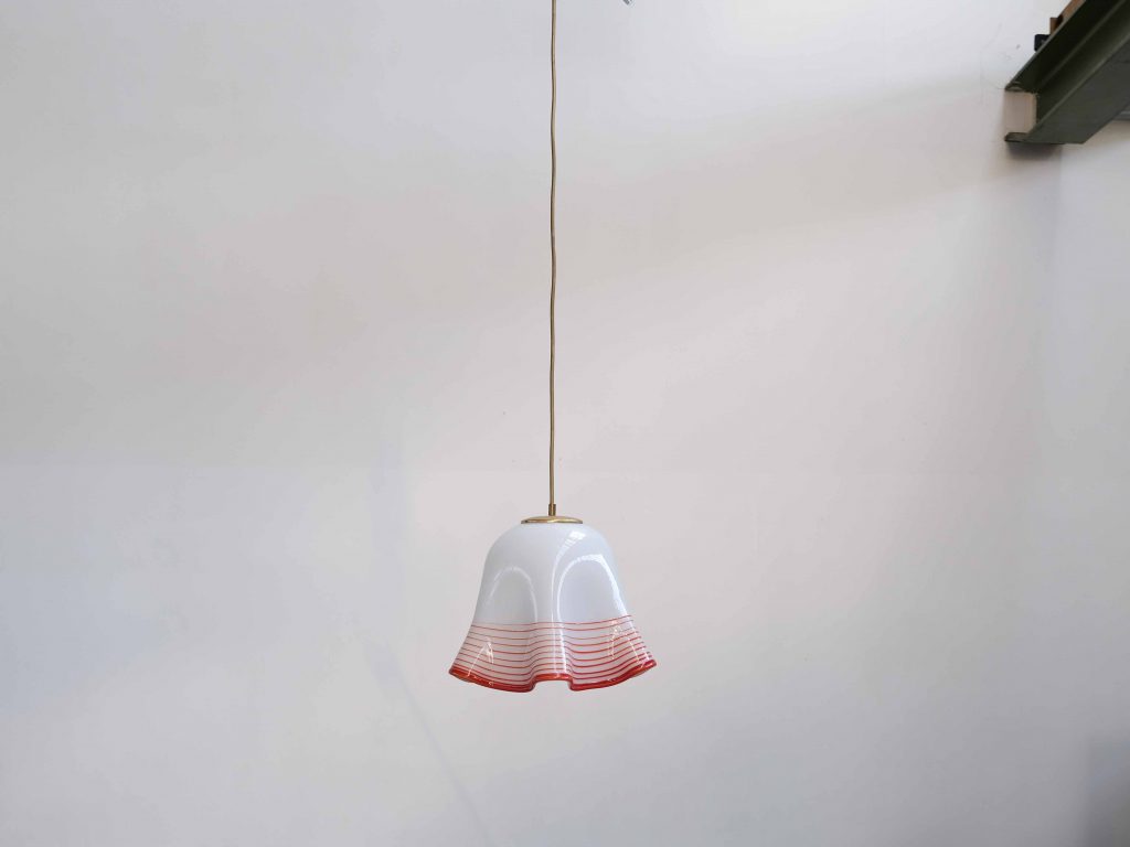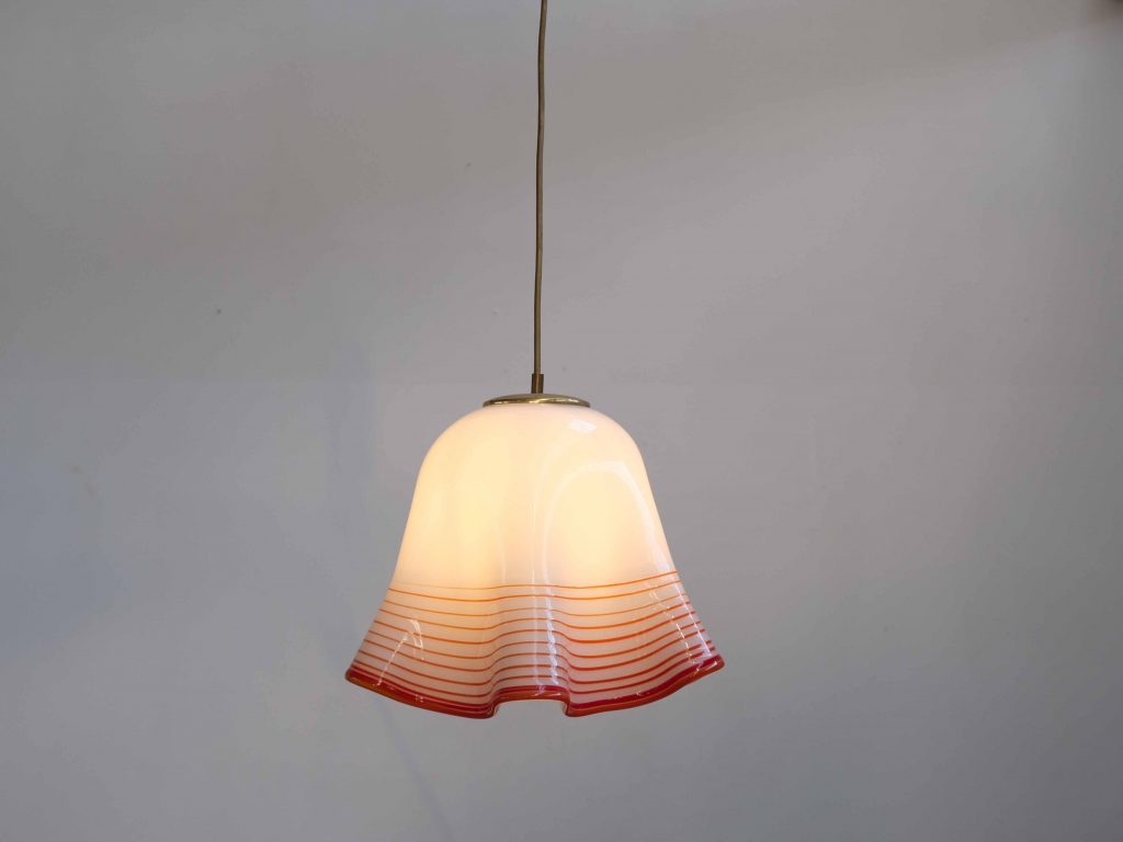 Die Leuchte steht stilistisch in der Tradition der Murano Glaskunst und spiegelt die hohe Handwerksqualität italienischer Glasmanufakturen dieser Zeit wider. Besonders die Kombination aus opalweißem Glas und dekorativen Farbakzenten sorgt für ein angenehm diffuses, warmes Licht und macht sie zu einem atmosphärischen Highlight über Esstischen, in Küchen oder Wohnbereichen.