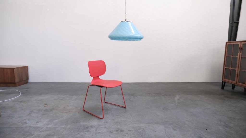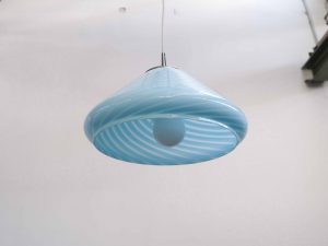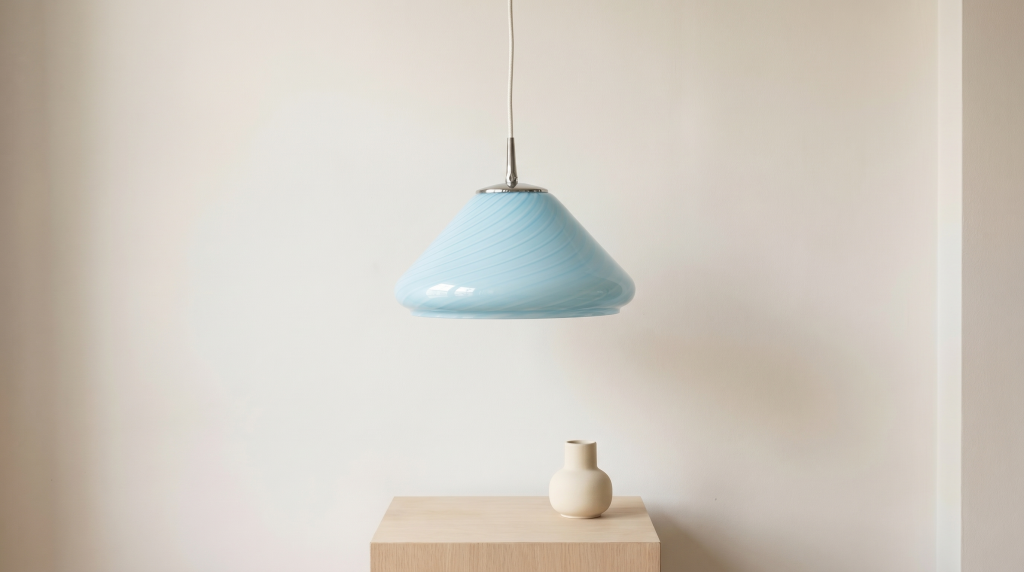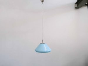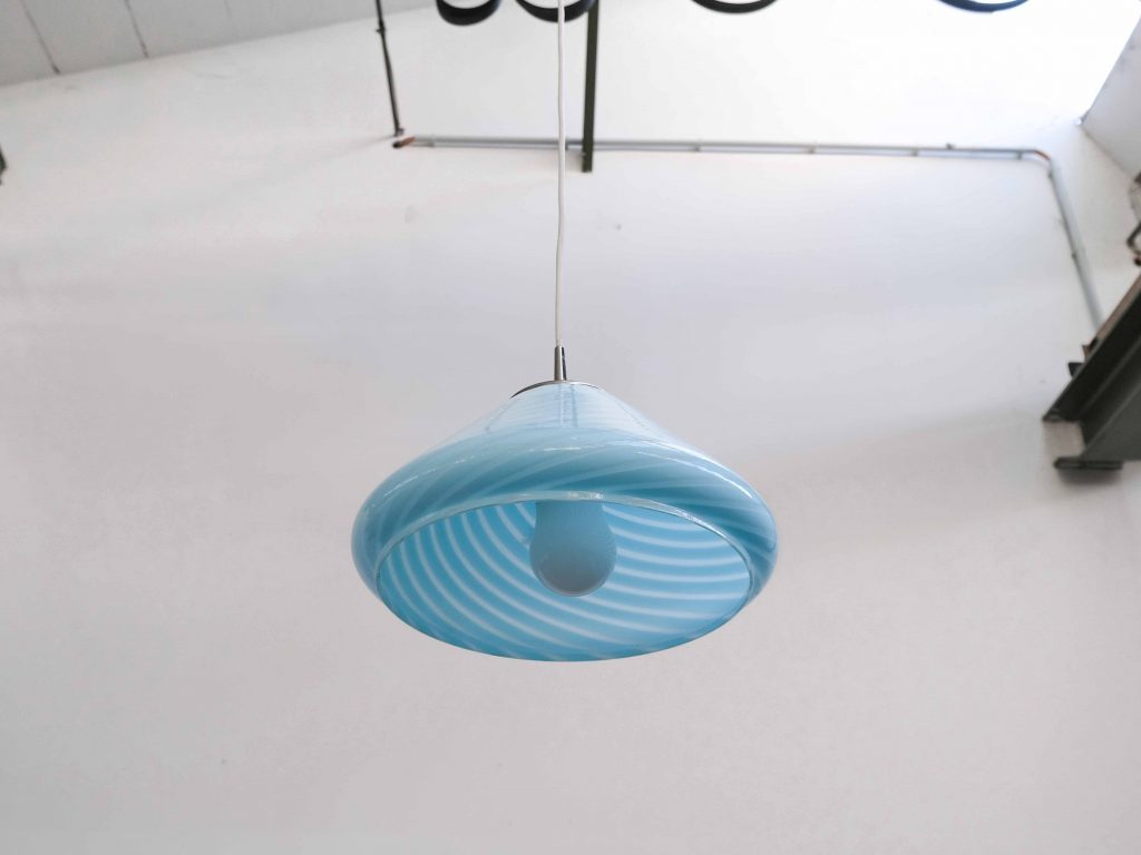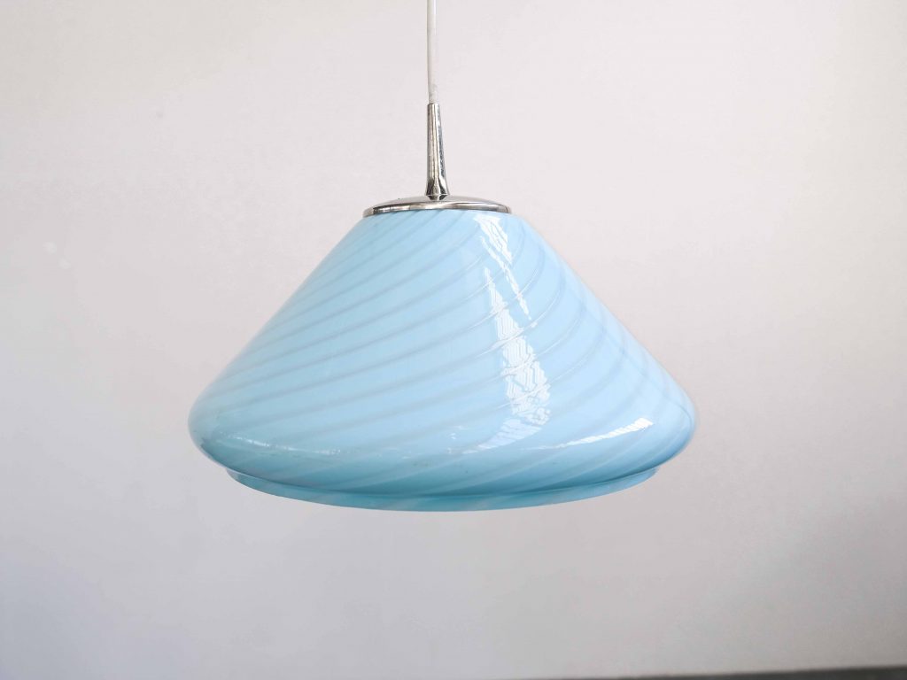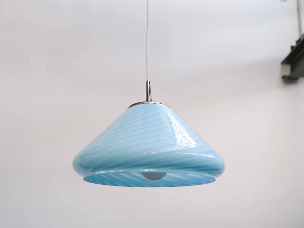 Die Bloma Pendelleuchte ist ein elegantes Vintage Designobjekt aus den 1970er Jahren und besticht durch ihre weiche, organische Form sowie die charakteristische Farbgebung in zartem Blau. Gefertigt aus hochwertigem Murano Glas aus Italien, steht die Leuchte für traditionelle Glaskunst und außergewöhnliche Materialqualität.