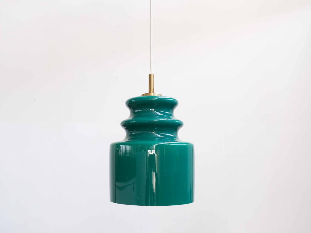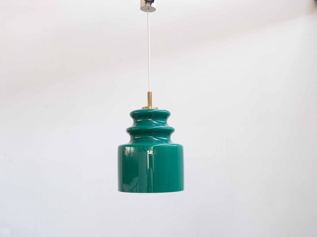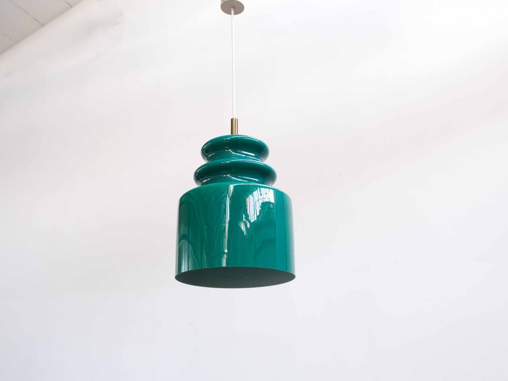 Die Grønvik Pendelleuchte ist ein ausdrucksstarkes Vintage Designobjekt der 1960er bis 1970er Jahre und überzeugt durch ihre skulpturale Form sowie die intensive, tiefgrüne Glasfarbe. Gefertigt aus hochwertigem Opalglas und kombiniert mit eleganten Messingelementen, vereint diese Leuchte klare Formsprache mit einer starken visuellen Präsenz.