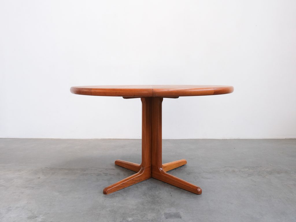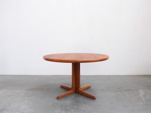 Die runde Tischplatte mit ihrer schönen Holzmaserung bildet zusammen mit dem stabilen Mittelfuß ein harmonisches Gesamtbild. Das durchdachte Design sorgt nicht nur für eine ästhetische Leichtigkeit, sondern auch für maximale Beinfreiheit – ideal für gesellige Runden oder stilvolle Essbereiche. Gerade dänische Hersteller wie Johs. Kristoffersen & Søn waren in den 1960er und 1970er Jahren bekannt für ihre langlebigen Möbelstücke, die heute als echte Designklassiker gelten.