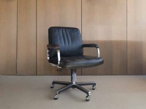 Der SEDURAN Bürosessel von Sedus ist ein hochwertiger Vintage Drehstuhl aus der Mid Century Ära und vereint funktionales Design mit zeitloser Ästhetik. Die Kombination aus schwarzem Leder, verchromten Metallelementen und klarer Linienführung verleiht dem Sessel eine elegante und zugleich industrielle Ausstrahlung.