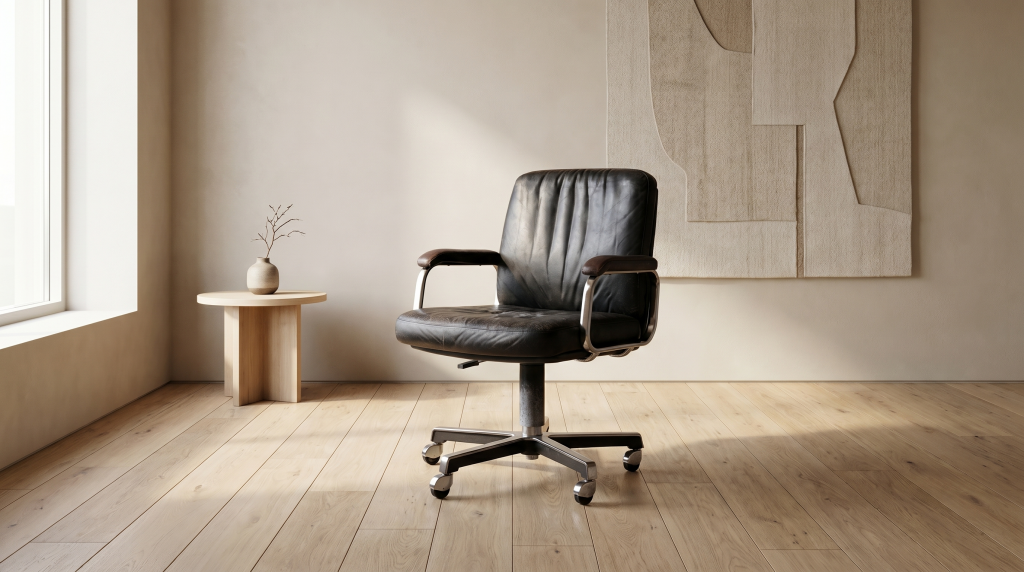 Die ergonomisch geformte Sitz- und Rückenfläche sorgt für angenehmen Sitzkomfort, während die charakteristischen Armlehnen mit Lederauflagen und die stabile Drehbasis den funktionalen Anspruch unterstreichen. Durch die hochwertige Verarbeitung und die langlebigen Materialien eignet sich der Sessel sowohl für den täglichen Einsatz im Homeoffice als auch als stilvolles Statement-Piece im Arbeits- oder Wohnbereich.