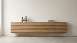 Ein besonderes Merkmal ist die durchdachte Wandmontage über eine stabile Holzschiene. Dadurch scheint das Sideboard förmlich an der Wand zu schweben und verleiht dem Raum Leichtigkeit und Modernität. Diese schwebende Konstruktion unterstreicht den handwerklichen Anspruch und die technische Raffinesse des Designs.