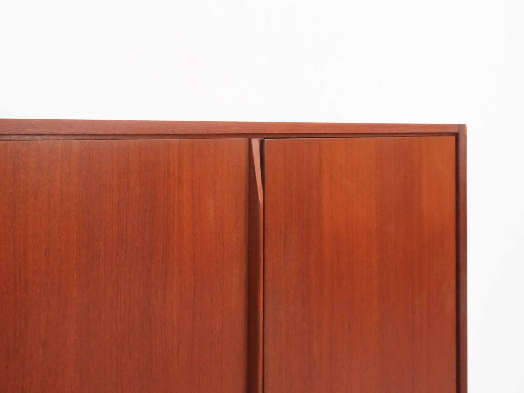 Die warme Teakholz-Maserung verleiht dem Möbel Tiefe und Eleganz, während die schlanken, konischen Beine die typische Leichtigkeit des skandinavischen Designs unterstreichen.