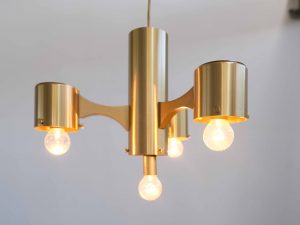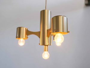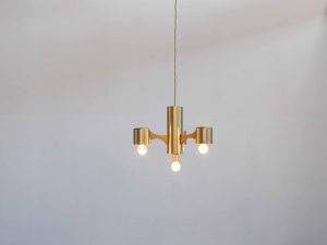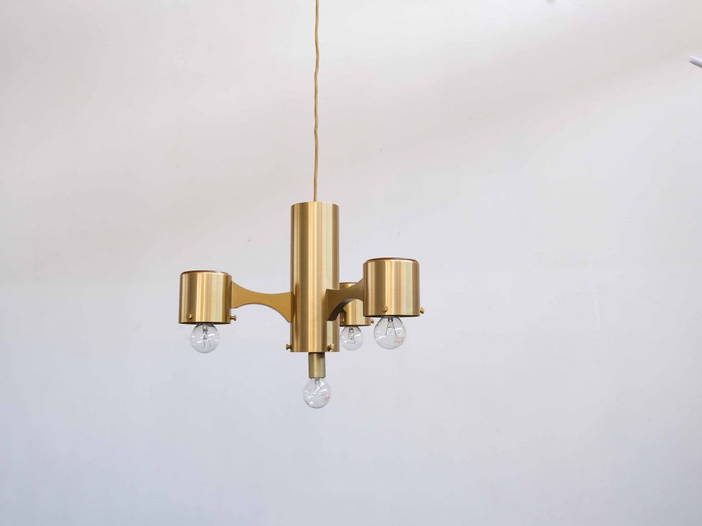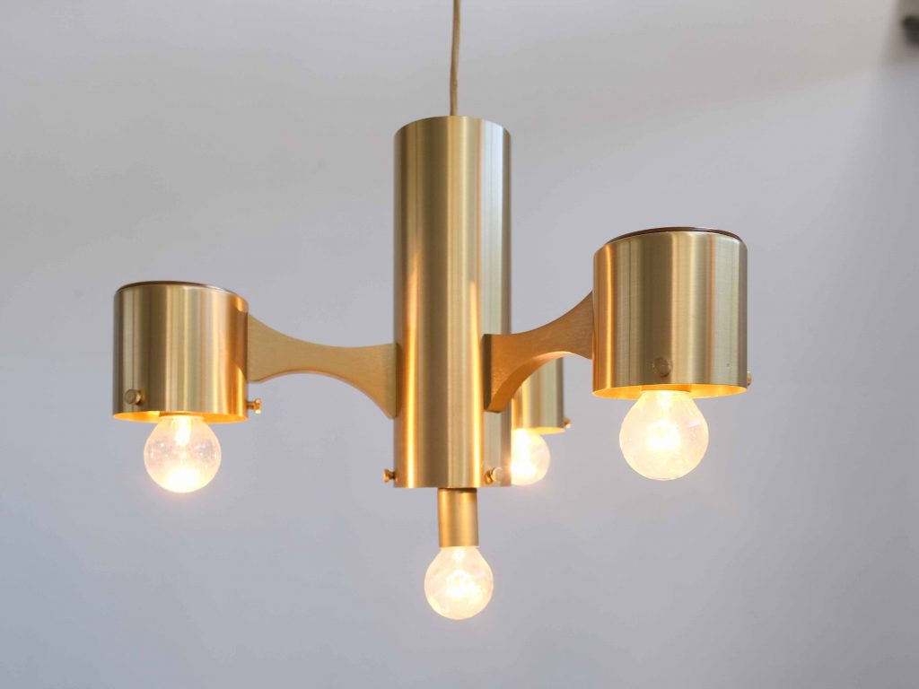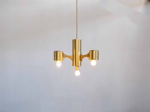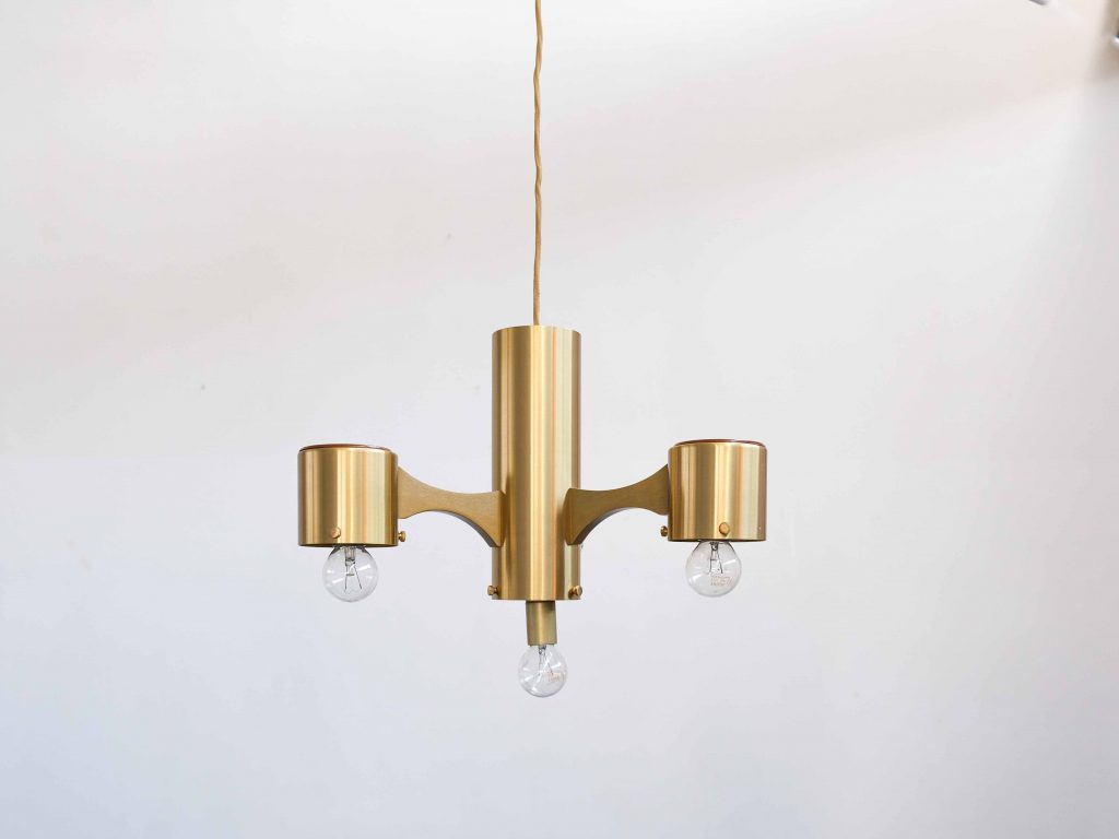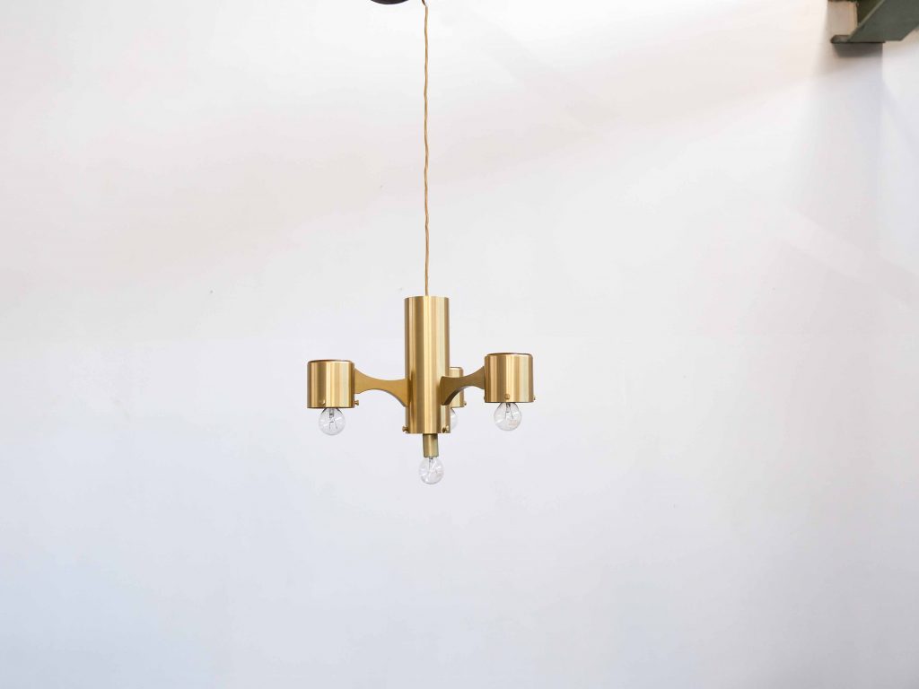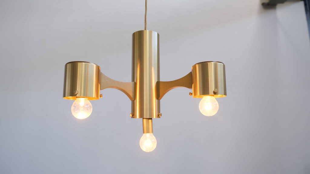 Der Solvar Kronleuchter ist ein elegantes Vintage Designobjekt im Stil der 60er und 70er Jahre und verbindet Mid-Century Klarheit mit charakteristischen Space Age Elementen. Gefertigt aus hochwertigem Messing, überzeugt die Leuchte durch ihre reduzierte, geometrische Form und die harmonisch ausbalancierte dreiarmige Konstruktion.
