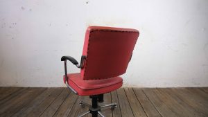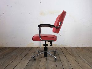 Dieser charakterstarke Drehstuhl vereint funktionales Design mit einer klaren, industriellen Ästhetik der Mid-Century Ära. Die markante rote Polsterung setzt einen selbstbewussten Akzent, während das verchromte Gestell und die schwarzen Armauflagen für einen spannenden Materialkontrast sorgen.