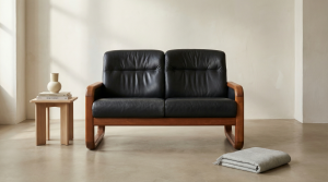 Zweisitzer Sofa mit markanter Kombination aus massivem Holzrahmen und hochwertiger Lederpolsterung. Die weich geschwungenen Armlehnen aus Holz verleihen dem Design eine skulpturale Leichtigkeit und setzen einen warmen Kontrast zum dunklen Leder.