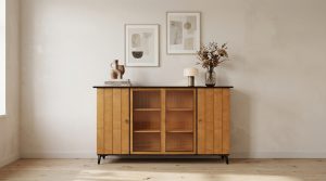SVALBY ist ein MidCentury Highboard im skandinavischen Stil, das durch seine elegante Formensprache und klare Linien überzeugt. Das Möbelstück kombiniert zwei seitliche Türen mit einer markanten Lamellenstruktur und eine zentrale Vitrine mit Schiebetüren aus geriffeltem Glas. Diese Kombination schafft ein spannendes Wechselspiel zwischen offenem und geschlossenem Stauraum und bietet Platz sowohl für die stilvolle Präsentation von Gläsern, Porzellan oder Dekorationsobjekten als auch für praktische Aufbewahrung.