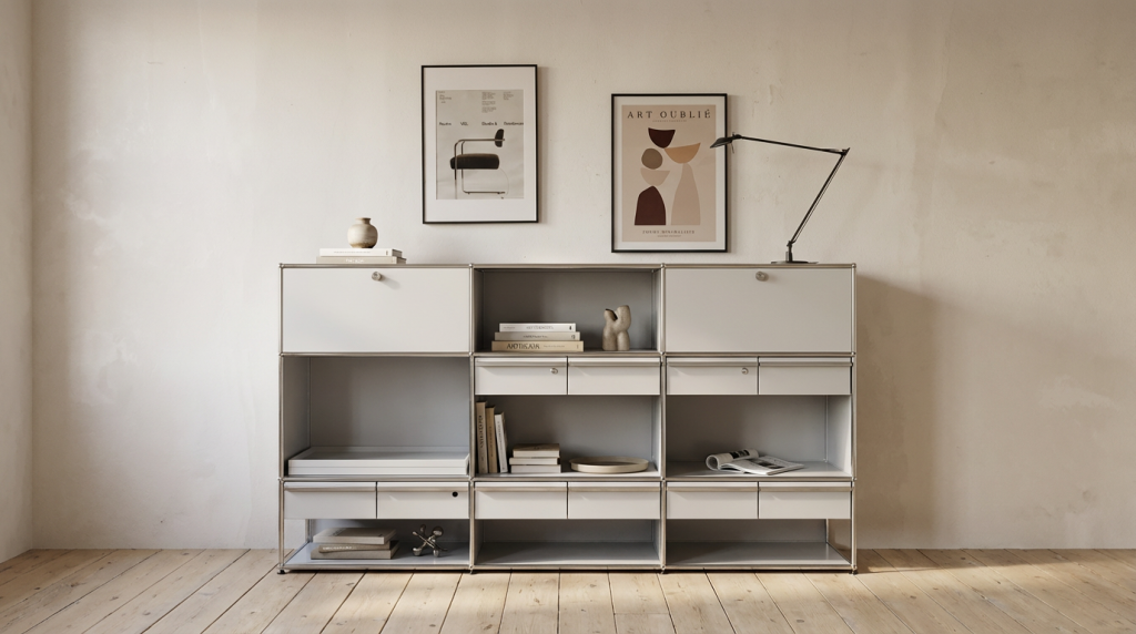Dieses USM Haller Sideboard überzeugt durch zeitloses Design und hohe Funktionalität. Die modulare Struktur aus verchromtem Stahlrohr und lichtgrauen Elementen bietet vielfältige Stauraumoptionen: Sechs Klappenfächer oben, zwei praktische Schubladen in der Mitte sowie großzügige Auszüge und offene Fächer im unteren Bereich. Ideal für Büro, Atelier oder Wohnraum – flexibel nutzbar für Akten, Technik oder persönliche Gegenstände. Die hochwertige Verarbeitung und das klare Design machen dieses Möbelstück zu einem langlebigen Klassiker. Es lässt sich bei Bedarf erweitern oder umgestalten und passt sich so jeder Raumsituation perfekt an. Ein funktionales Designobjekt mit Stil – made in Switzerland.