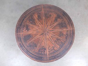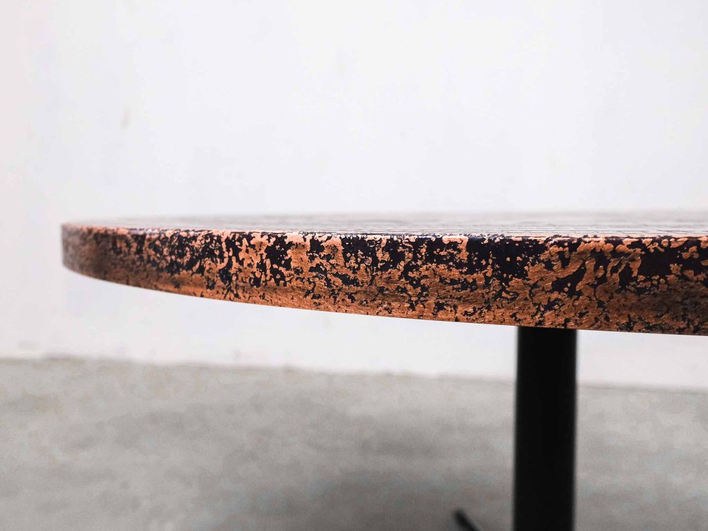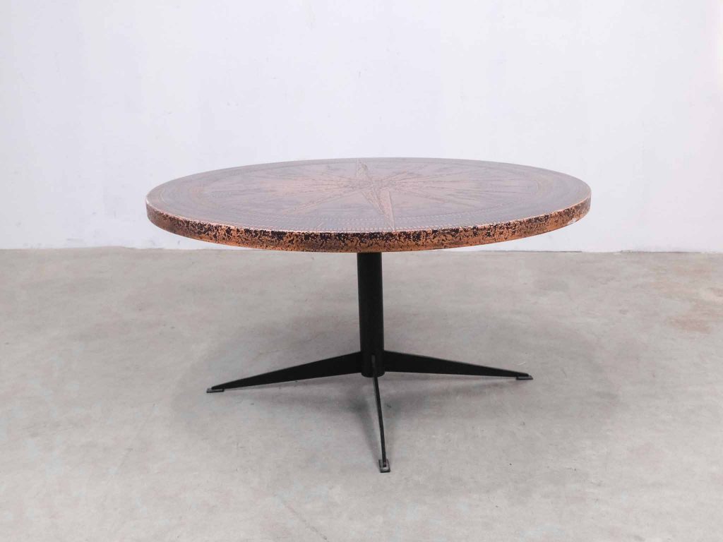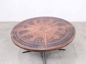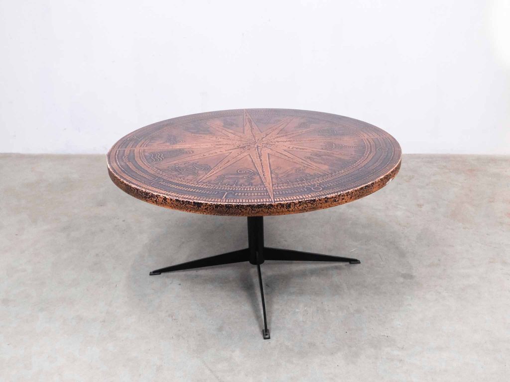 Dieser außergewöhnliche Zodiak Tisch ist ein eindrucksvolles Beispiel brutalistischen Designs und stammt aus der Vintage Ära. Die runde Tischplatte besteht aus massivem Kupfer und ist mit einem detailreich geprägten Zodiak-Motiv versehen, das dem Möbelstück eine unverwechselbare Ausstrahlung verleiht. Das stabile Metallgestell sorgt für sicheren Stand und bildet einen klaren Kontrast zur warm schimmernden Platte. Der Tisch ist nicht nur ein funktionales Möbelstück, sondern auch ein künstlerisches Statement, das jeden Raum bereichert. Ideal als Couchtisch oder Blickfang in einem stilvollen Interieur setzt er ein starkes Zeichen für Liebhaber von Vintage und brutalistischem Design.
